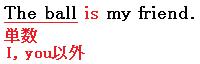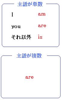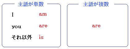 主語が単数(1人、または1つ)のときは、「I」には「am」がつき、「you」には「are」がつき、「それ以外」には「is」がつきます。
