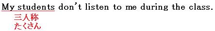 主語(「~は」の部分)の人称と数に気をつけながら英語にしてみましょう。 指差し確認しながら英語にすると間違えにくくなります。「三単現の時にdon'tで否定すると気持ち悪い!」ってなるまで、声に出して練習しましょう!